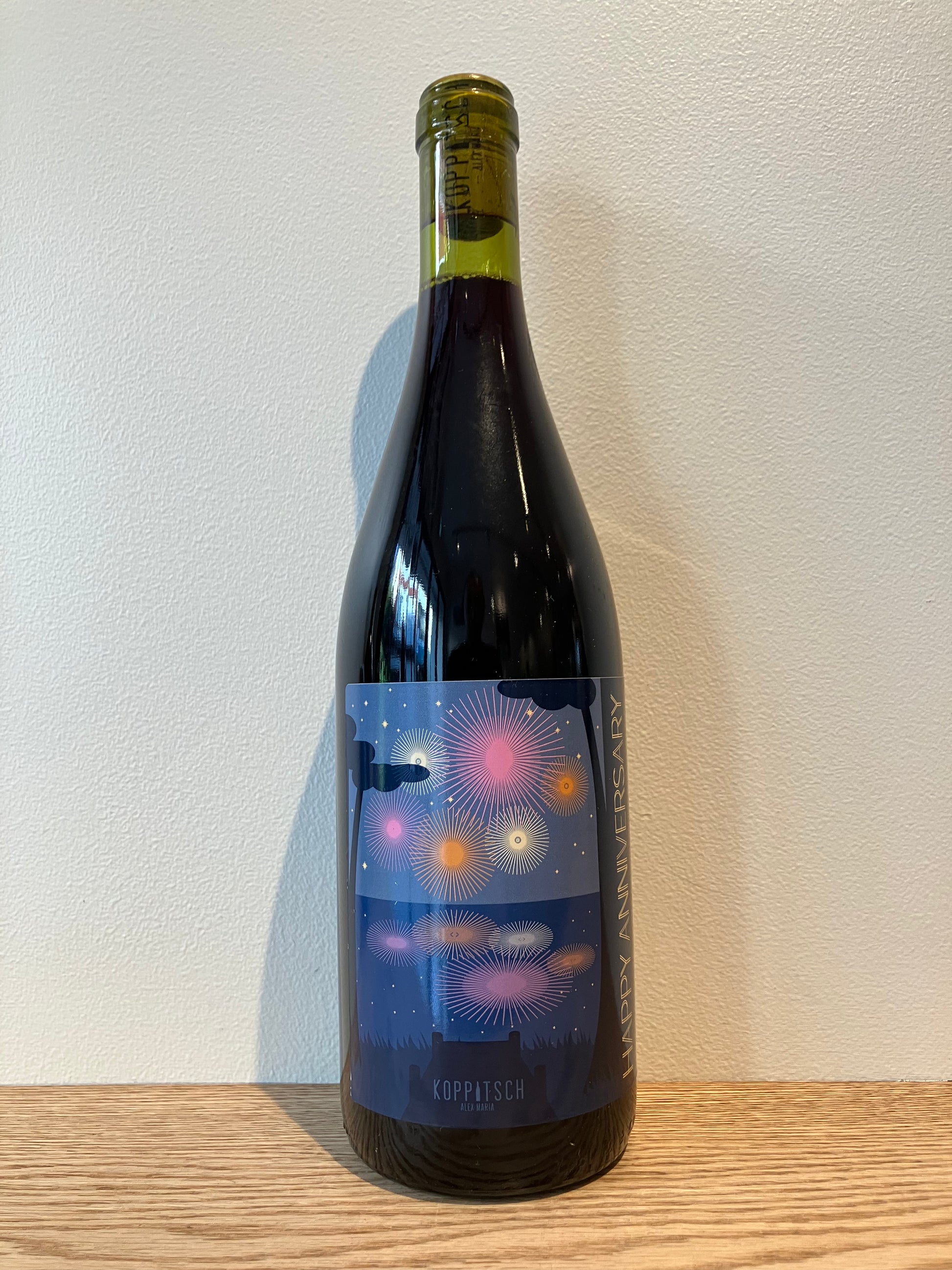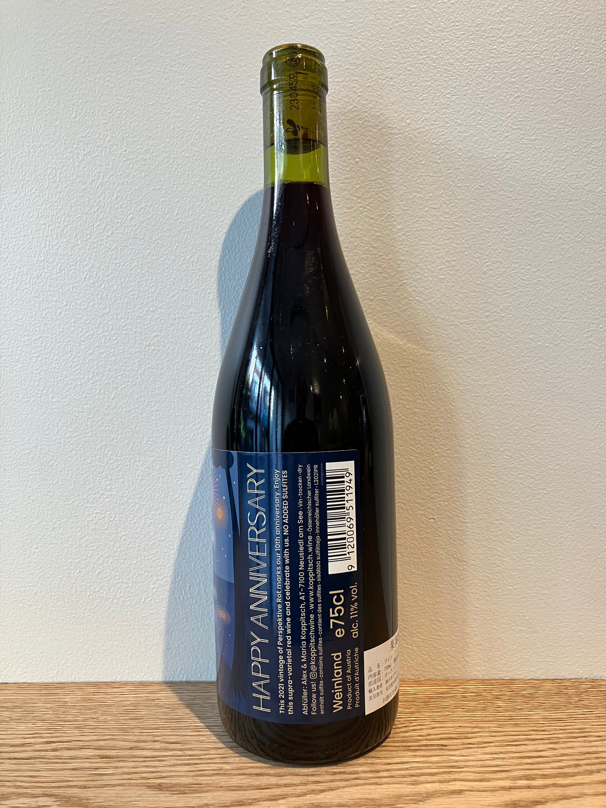 2021 年 9 月に手作業にて収穫、個々の葡萄を別々に発酵。部分的に除梗(約 10%茎を残す)ファイバーグラスパットとスチール タンクを使用し自然発酵。10 日後、マッシュをプレスし、ポンプでアカシア樽へ。澱と共に22か月熟成。瓶詰め前日に各ワインを ブレンドし、2023 年 7月下旬にボトリング。全ての工程で温度管理はなし、亜硫酸無添加、無清澄、無濾過。 2021 年はコピッチがワインの経営を引き継いで、10周年を迎えた年。普段このワインは”PERSPEKTIVE ROT”としてリリースしていま すが、この年を記念して“HAPPY ANNIVERSARY 2021”というワイン名と花火が上がる特別なラベルでリリース。また今季でこのシリ ーズは生産終了となるため、ラストヴィンテージとなります。淡い濁りのある紫がかった赤色。サワーチェリー、プラム、少しのリコリスと スパイスのアロマ。軽やかなボディにドライなサワーチェリーやラズベリーのニュアンスに、少しのスパイスとハーブがアクセント。酸もし っかりと感じられ、シャープでハーバルな印象も。