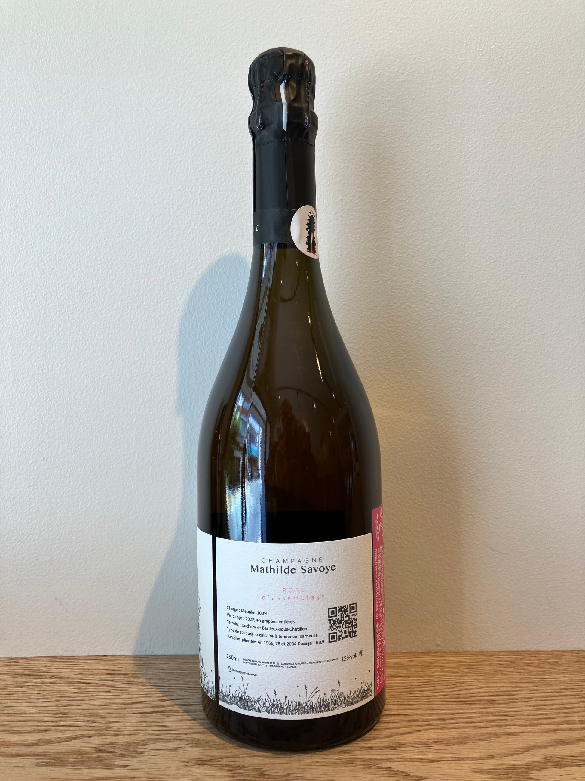 醸造:ブラン・ド・ノワールのムニエは、手摘みで収穫した二つのリュー・ディのブドウを一緒に圧搾して、ステンレスタンクで発酵。マロ発酵は行わずに引き続きタンクで熟成。赤ワインのムニエは、手摘みで収穫後、除梗して軽く破砕。ステンレスタンクで4日間マセラシオン・カルボニック。この間、1日2回のルモンタージュを行う。タンクは開放式のオープントップで、二酸化炭素の注入は行わず、自重で潰れたブドウから出てきた二酸化炭素を利用する。圧搾後、2/3をフレンチ・オークのバリック(新樽は用いない)に移し、1/3はステンレスタンクでマロ発酵と熟成。5ヶ月の熟成後、ブラン・ド・ノワールと赤ワインをブレンドして無清澄でティラージュ。瓶内二次発酵とマチュラシオン・シュール・リー。ルミュアージュを手動で行って、デゴルジュマン。2022年の収穫は、白ワイン向けが9/4と9/5、赤ワイン向けが9/6。現行ロット(22ベース)は2023年2月にティラージュ。2024年5月にデゴルジュ。ドザージュは6g/l(表記はエクストラ・ブリュット)でMCRを使用。ガス圧は7.0気圧。総生産量650本。