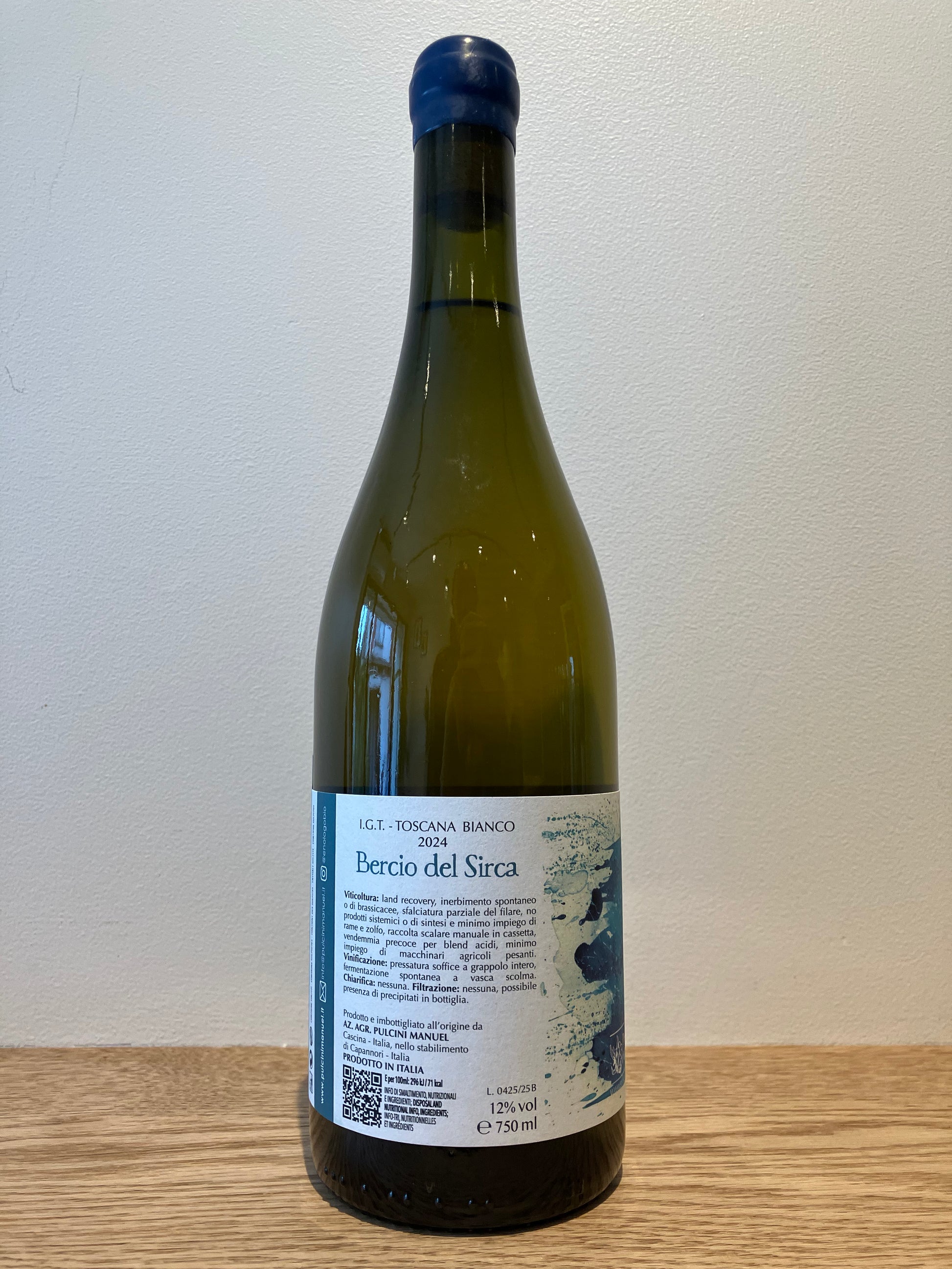 ブドウは手摘みで収穫。45%のブドウ(マルヴァジア30%、その他の白品種15%)は、8月20日から9月10日に比較的酸のある状態で収穫して、全房で圧搾。ヴェルメンティーノは9月1日~15日に収穫して、全房で圧搾。これらを低温で清澄した後、別々に野生酵母のみでステンレスタンクで自発的に発酵。その後マロ発酵と熟成。醸造添加物は一切加えずに醸造する。ブレンドは瓶詰め前に行い、無清澄・ノンフィルターで瓶詰め。SO2はボトリング後のワインのネガティブな反応を避けるために必要最低限のみ添加。2024ヴィンテージは総生産量1,472本。2025年7月時点のSO2トータルは20mg/l。