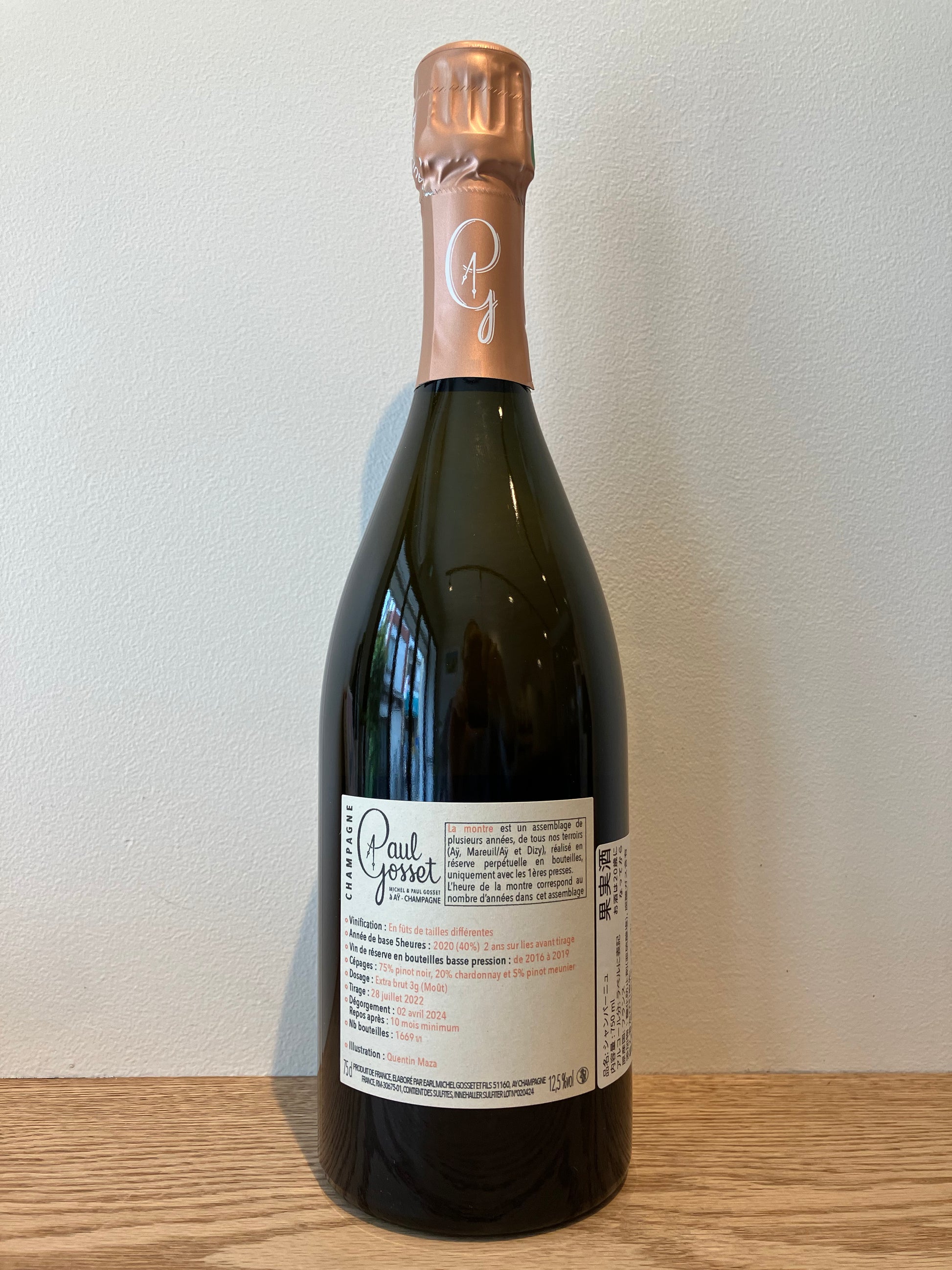 すべてのテロワール(アイ、マルイユ シュール アイ、ディジィ、シュ イィ)のブドウから作られたキュヴェ。 このキュヴェは、最終的に12年の異なるワインをブレンドすることを目標と しています。その間、時計の針は正確で毎年1時間動き、異なるワインの年 に応じてブレンドします。最初の時計の通知は4時間なので、2016年と2017 年と2018年と2019年の組み立てになります。このヴィンテージの目標は、時 計の12時間は12年間を象徴し、永続的なリザーブワインを造り続ける事が目 標です。永久的なリザーブワインの大部分は、大樽やまたは熟成樽で作られ ています(例えば「デ ジュール デ ムイ」のように)。 これらはボトルで作っているので違います。毎年、収穫時に、ごく一部をセ ラーのボトルに入れて、非常に繊細な泡でリザーブします(保存用)。その 後、同じブレンドにおいて毎年、収穫の一部をボトルに入れます。 時計が12年のワインを持っているとき、最初の年のためにリザーブされたワ インは、新しい年のワインに場所を譲るために完全に使い果たされます。こ れが「永続的な循環」を構築します。 モントルの価格は、その進行に応じて変化します。