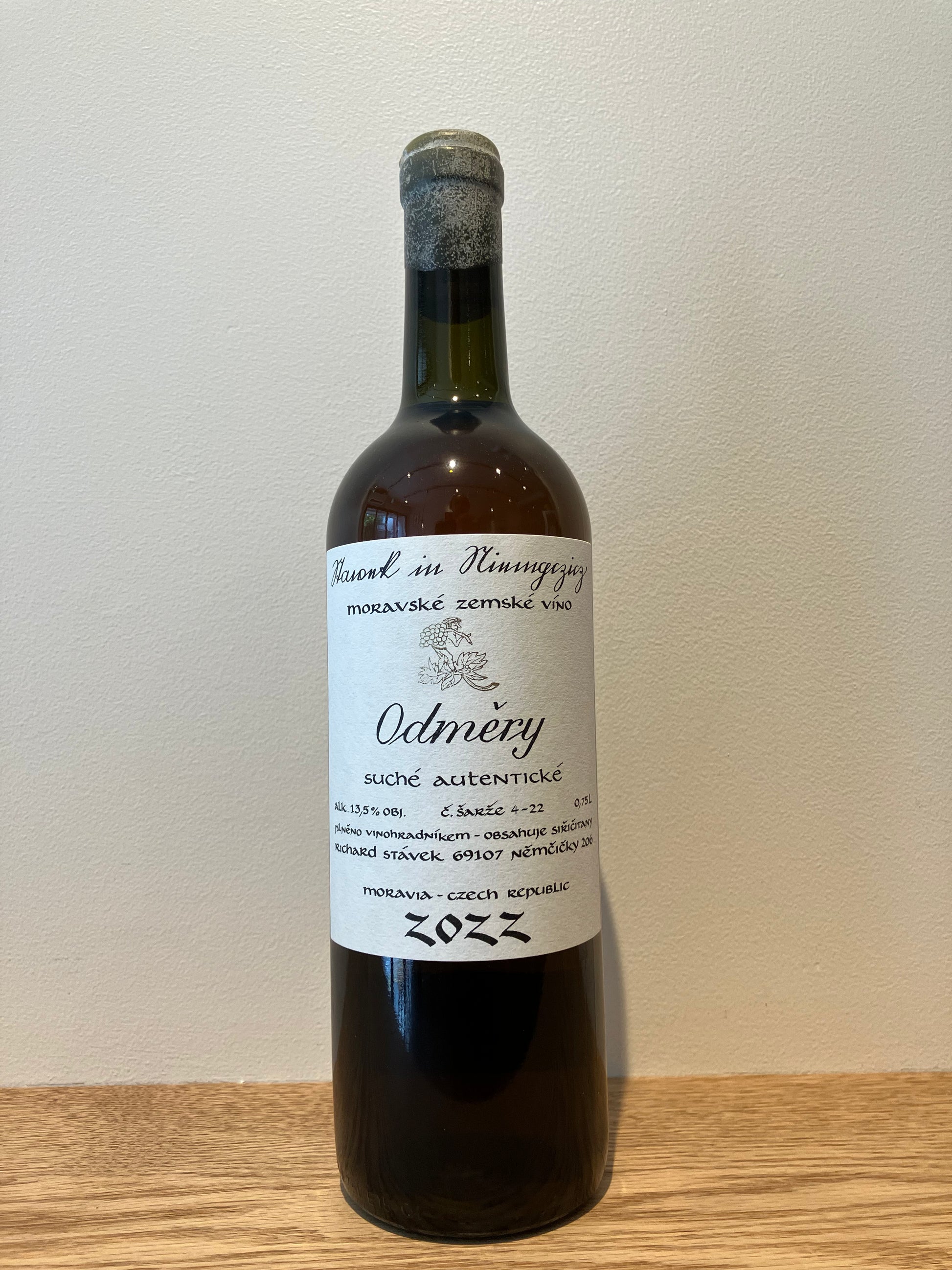 収量約 18hl/ha。黄土、粘土。Odměryは畑の名前 です。手摘みで収穫したブドウを足でつぶし ます。除梗はしません。自発的な醗酵を促し、 房ごとマセレーションをします。バトナージュ をしながら10カ月の熟成。樽はモラビア周辺 で取れたニセアカシア (Robinia pseudoacacia)600ℓの樽を使用します。醸造 中及びすべての工程で亜硫酸は加えませ ん。一切のろ過はせずに瓶詰となります。22 年の過熟したブドウからもたらされたOdměry は、大きなポテンシャルを持っています。近 年最高の出来とのこと。 温州ミカン、ネーブルオレンジ、あけび、びわ、 あんず、ルバーブetc。普段のオドミャレであ れば内向的だったはずの香りが、外向に傾き、ワインに悠々とした余裕を感じます。チンザノの様な薬酒、みたらし団子、伝統的なみりん、ゆったりとした中に多様な要素を感じます。つつましさの中にある内面の充実は偉大な人を見ているようでもあり、浄土の淵で大河を眺めているような没我的なイメージが浮 かできたりもします。飲み手の内面に訴えかけてくるワインです。