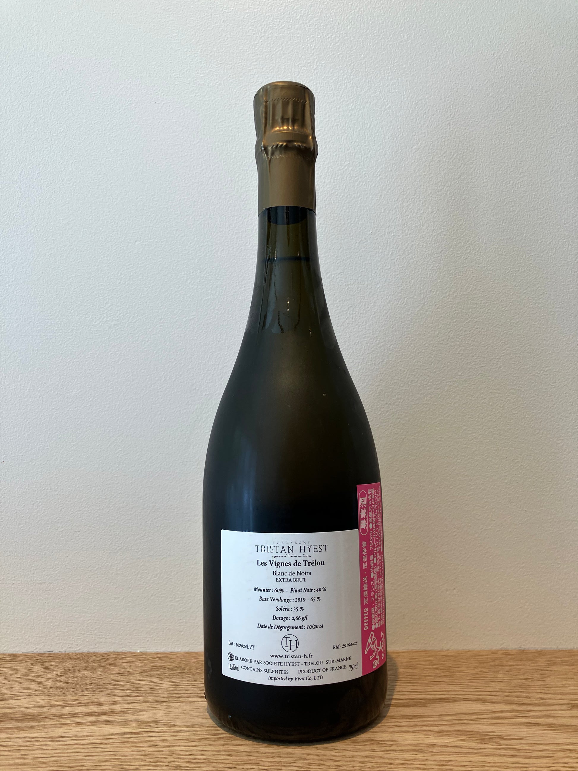 トリスタン・イエスト自身のコメント:このキュヴェを醸造した狙いは、ヴァレ・ド・ラ・マルヌのスペシャリテであるムニエをフューチャーするためです。私はピノ・ノワールによって骨格が作られたムニエベースのキュヴェが好みです。ムニエは、魅力的なアロマと熟度と複雑さを、そしてピノ・ノワールは、ストラクチャーと長命さをワインにもたらしてくれます。醸造:ステンレスタンクでアルコール発酵を行い、引き続き7ヶ月間熟成。この間にマロ発酵を完全に実施。その後、ティラージュして瓶内二次発酵とマチュラション・シュール・リー。現行ロット:2019年のベースワイン 65%、リザーブワイン(2011~2018年のソレラ)35%。ティラージュ:2020年7月29日 デゴルジュ:2024年10月7日 マチュラション・シュール・リーの期間:50ヵ月。 ドザージュ:2.66g/l(エクストラ・ブリュット) 総生産量:1,451本 アルコール度数:12.5度 ガス圧:7.5気圧。